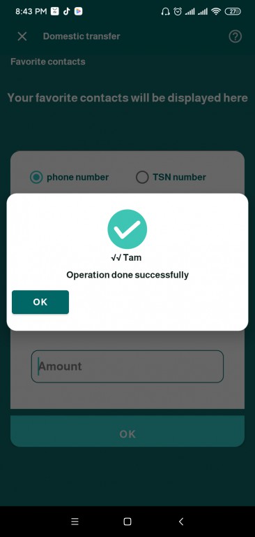 A notification appears in the app confirming the successful transaction, and an SMS is sent to the customer with the transaction details.